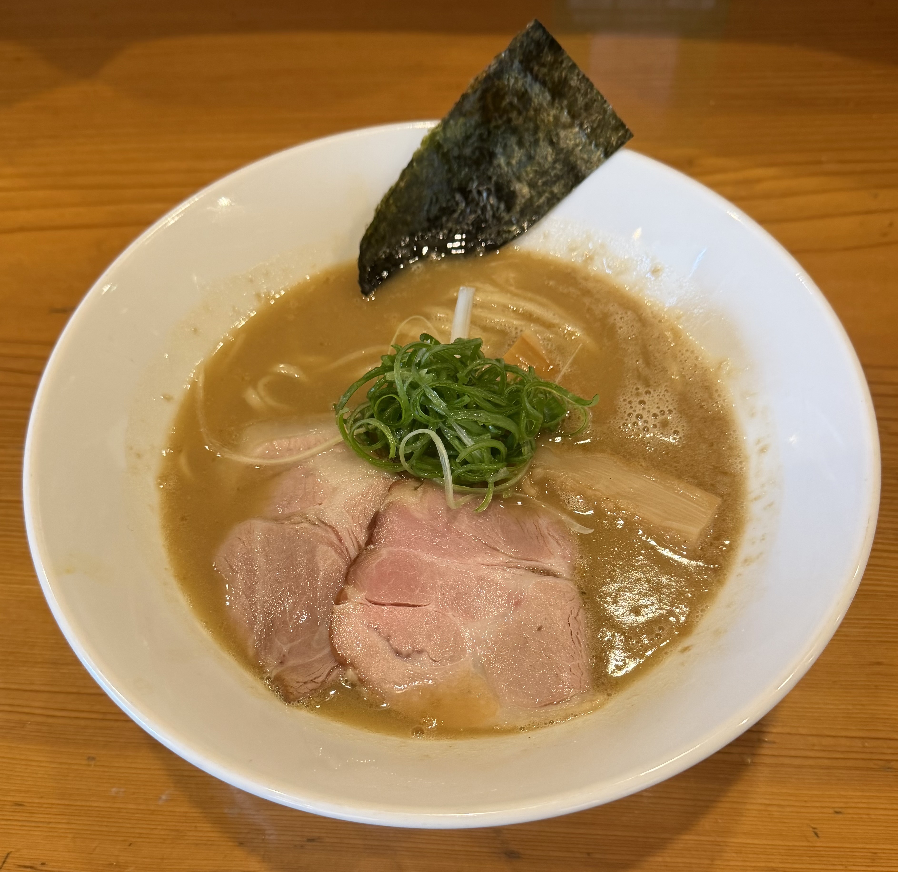 加水高めの全粒粉入り自家製細打ちストレート麺。少し平打ち気味でツルモチ食感、スープリフトも上々。程よいスープの塩みが相まって麺の甘さが引き立ちます。